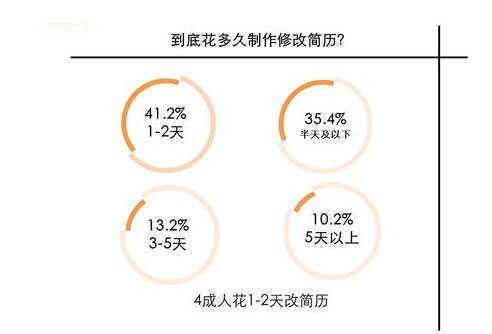 根據(jù)調(diào)查顯示,41.2%的人制作修改簡歷需要1-2天;35.4%受訪者表示制作與修改簡歷的時間在半天左右;有10.2%的人制作修改簡歷的時間在5天以上。